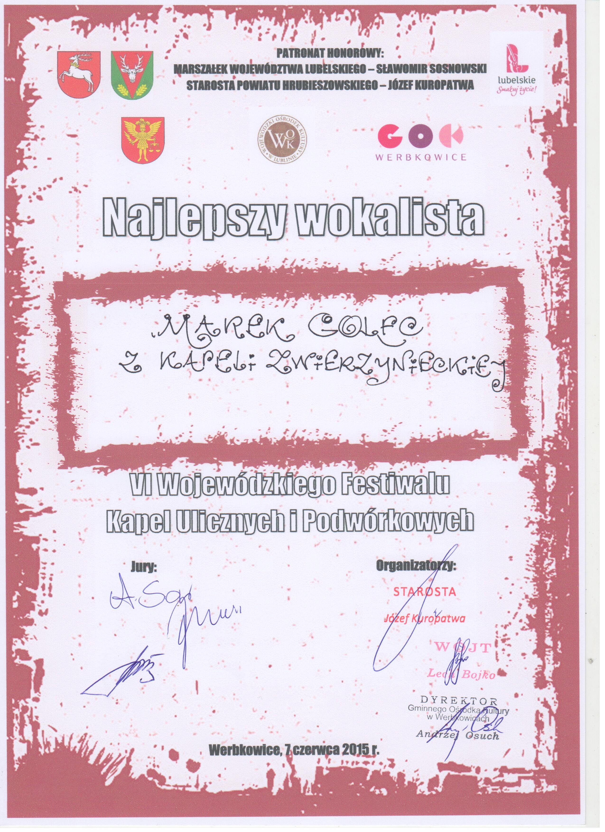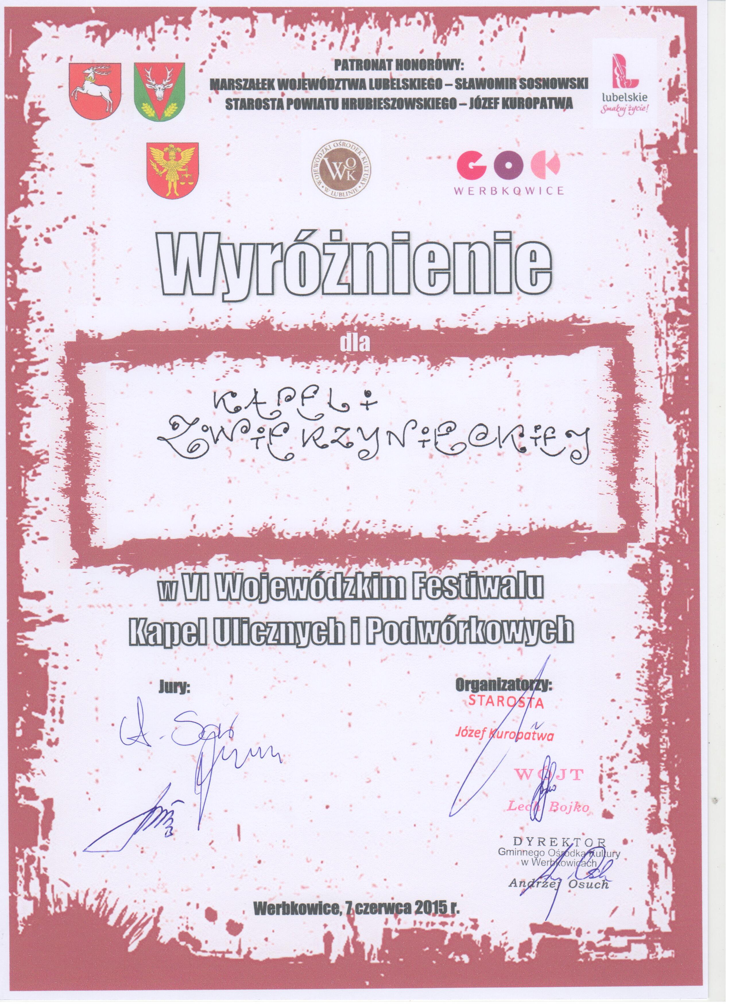 W czasie VI Wojewódzkiego Festiwalu Kapel Ulicznych i Podwórkowych, który odbył się 7 czerwca w Werbkowicach, Kapela Zwierzyniecka otrzymała wyróżnienie natomiast wokalista kapeli Marek Golec został uhonorowany tytułem najlepszego wokalisty. W przeglądzie uczestniczyło 9 kapel z województwa lubelskiego.Członkowie Kapeli Zwierzynieckiej wzięli również udział w Jarmarku Hetmańskim na Rynku Wielkim w Zamościu.